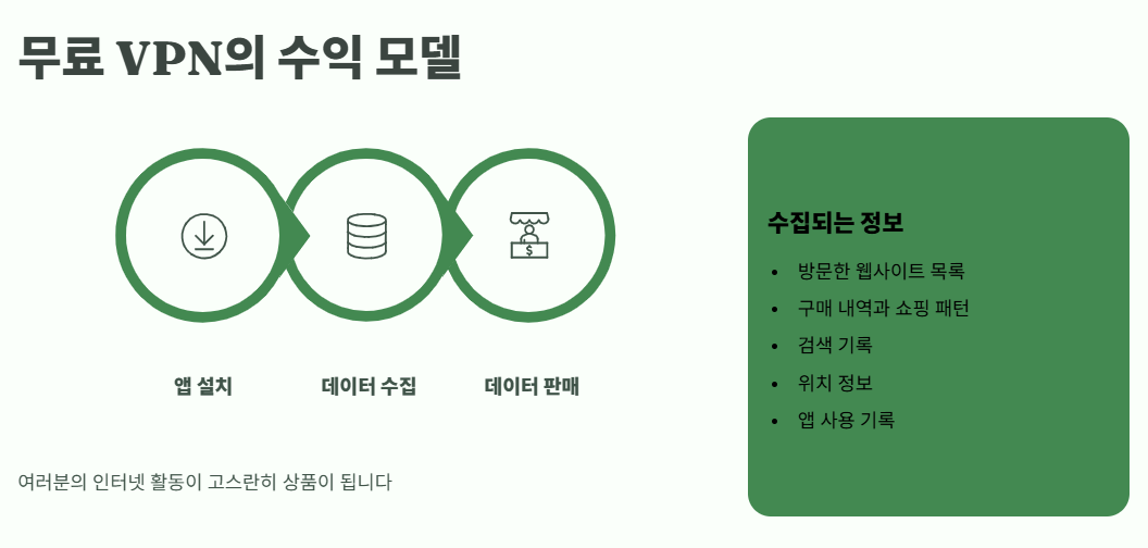 공짜 점심은 없다! "구독료가 0원이라고요? 그럼 당신의 개인정보가 그들의 월급입니다. 무료 VPN 뒤에 숨은 데이터 거래의 실체." 당신의 브라우징 기록은 이미 시장에 팔리고 있습니다.