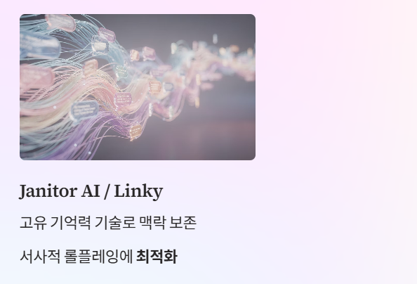 - Janitor AI / Linky: 고유의 AI 기술을 활용해 캐릭터의 기억력을 높인 것이 특징입니다. 장기적인 대화를 진행해도 앞서 나눈 맥락을 잊지 않아 서사적인 롤플레잉에 최적화되어 있습니다.
