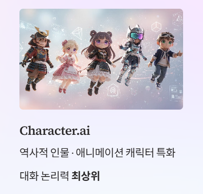 - Character.ai: 가장 거대한 사용자 기반을 가진 플랫폼으로, 역사적 인물이나 유명 애니메이션 캐릭터와의 대화에 특화되어 있습니다. 필터링이 엄격한 편이지만 대화의 논리력이 우수합니다.