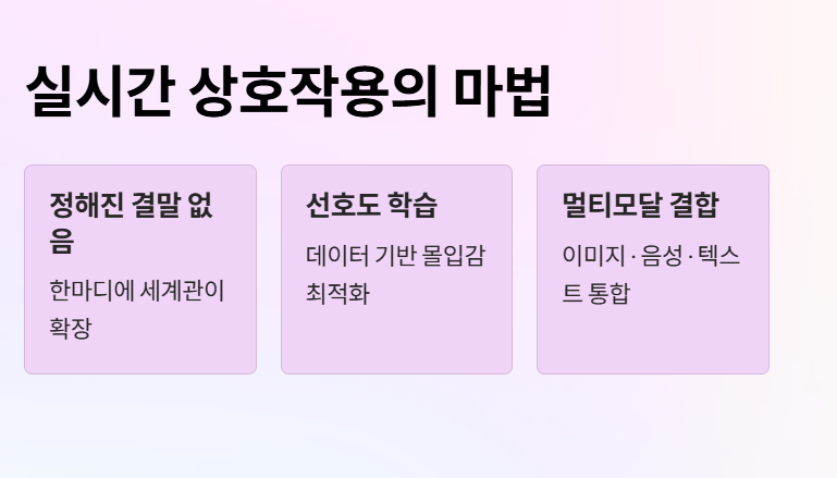 AI 캐릭터와의 롤플레잉은 기존의 텍스트 기반 게임이나 소설과는 차원이 다른 경험을 제공합니다. 가장 큰 이유는 '실시간 상호작용'입니다. 정해진 결말로 향하는 것이 아니라, 사용자의 말 한마디에 AI가 즉각적으로 반응하며 세계관을 확장해 나갑니다. 이는 데이터 분석 기술을 통해 사용자의 선호도를 학습한 AI가 최적의 몰입감을 제공하기 때문입니다.