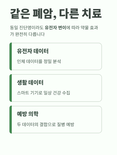 • 약물 유전체학 (Pharmacogenomics): 특정 환자가 약물을 빠르게 분해하거나 느리게 분해하는지 유전적으로 분석하여, 부작용을 최소화하고 약효를 극대화하는 적정 용량을 결정합니다.
