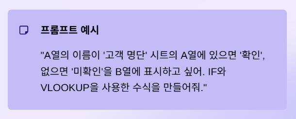 가장 많이 활용하는 방법은 AI에게 수식 생성을 요청하는 것입니다. VLOOKUP이나 IF 함수를 조합해야 하는 상황에서 AI는 아주 훌륭한 선생님입니다.