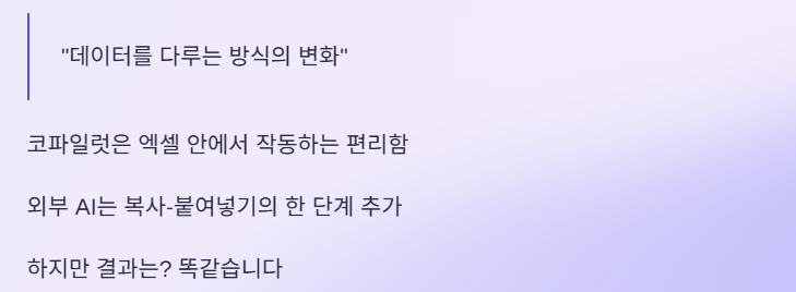 하지만 업무 자동화의 핵심은 도구가 아니라 '데이터를 다루는 방식의 변화'입니다. 코파일럿은 엑셀 내에서 직접 동작한다는 편리함이 있지만, 외부 AI 도구를 활용해도 동일하거나 유사한 결과물을 얻을 수 있습니다. 중요한 것은 인공지능에게 어떤 질문을 던져야 원하는 데이터를 얻을 수 있는지에 대한 '프롬프트 능력'입니다.