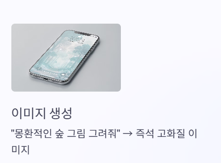 - 이미지 생성: "아이폰 배경화면에 어울리는 몽환적인 숲 그림 그려줘"라고 말하면 즉석에서 고화질 이미지를 생성합니다.