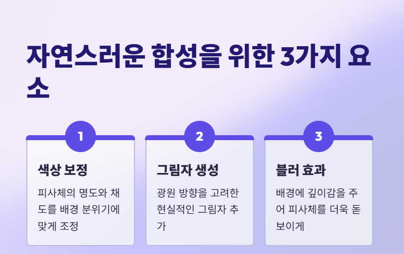 • 그림자 생성 (Shadow Rendering): 피사체 아래에 그림자를 넣어주면 훨씬 현실적으로 보입니다. 배경의 광원 방향을 고려하여 그림자의 위치와 진하기를 설정합니다.