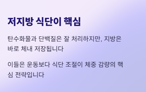 지방을 분해하는 유전자가 비활성인 사람은 '저지방 식단'이 필수적입니다. 탄수화물이나 단백질은 잘 처리하지만, 지방은 들어오는 대로 체내에 저장해 버리기 때문입니다. 이들은 운동보다는 식단 조절이 체중 감량의 핵심입니다.