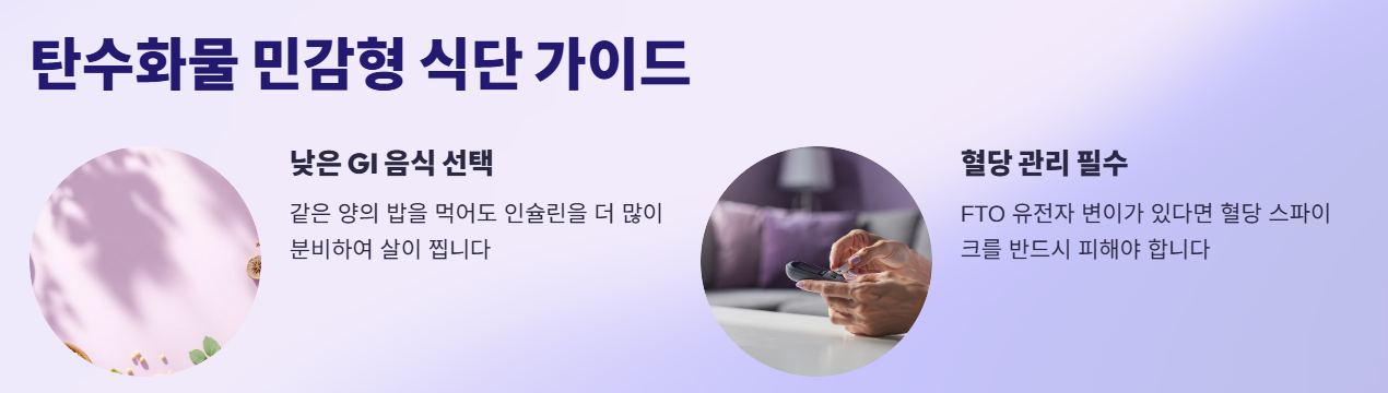 FTO 유전자 변이가 있는 등 탄수화물에 민감한 사람은 '저탄수화물 식단'이 효과적입니다. 같은 양의 밥을 먹어도 남들보다 더 많은 인슐린을 분비하여 살을 찌우기 때문입니다. 이들은 혈당지수(GI)가 낮은 음식을 섭취해야 합니다.