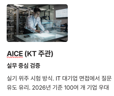 - AICE(KT 주관): 실무 중심의 검증. 실기 위주의 시험 방식 덕분에 IT 대기업 채용 시 실무 면접에서 질문을 유도하기 좋습니다. 2026년 기준 100여 개 기업에서 우대 중입니다.