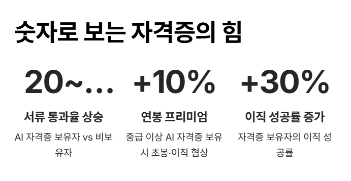 - 연봉 시너지: IT 전문지 조사 결과, 중급 이상의 AI 자격증 보유 시 초봉이나 이직 연봉 협상에서 평균 10%의 프리미엄이 형성되고 있습니다.