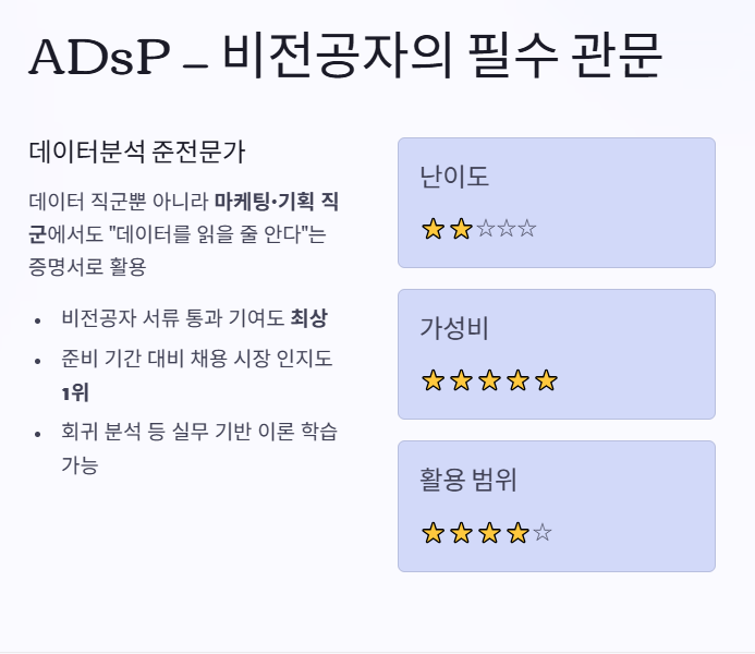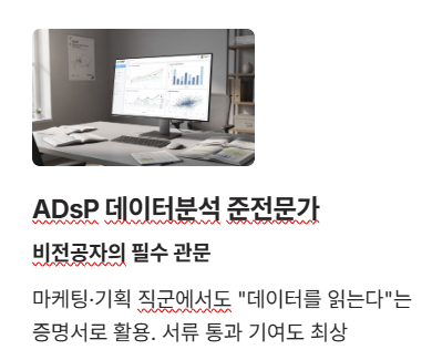 - ADsP(데이터분석 준전문가): 비전공자의 필수 관문. 데이터 직군뿐 아니라 마케팅, 기획 직군 지원 시 "데이터를 읽을 줄 안다"는 증명서로 널리 쓰입니다. (서류 통과 기여도 높음)