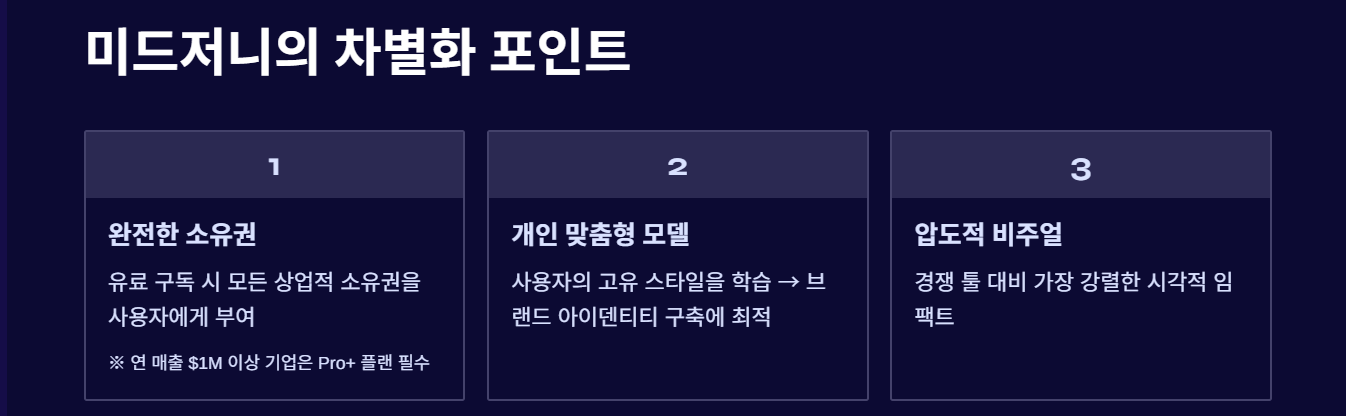 - 소유권 정책: 유료 구독 시 생성된 이미지에 대한 모든 상업적 소유권을 사용자에게 부여합니다. 단, 연 매출 100만 달러 이상의 대기업은 프로 이상의 플랜을 사용해야 합니다.