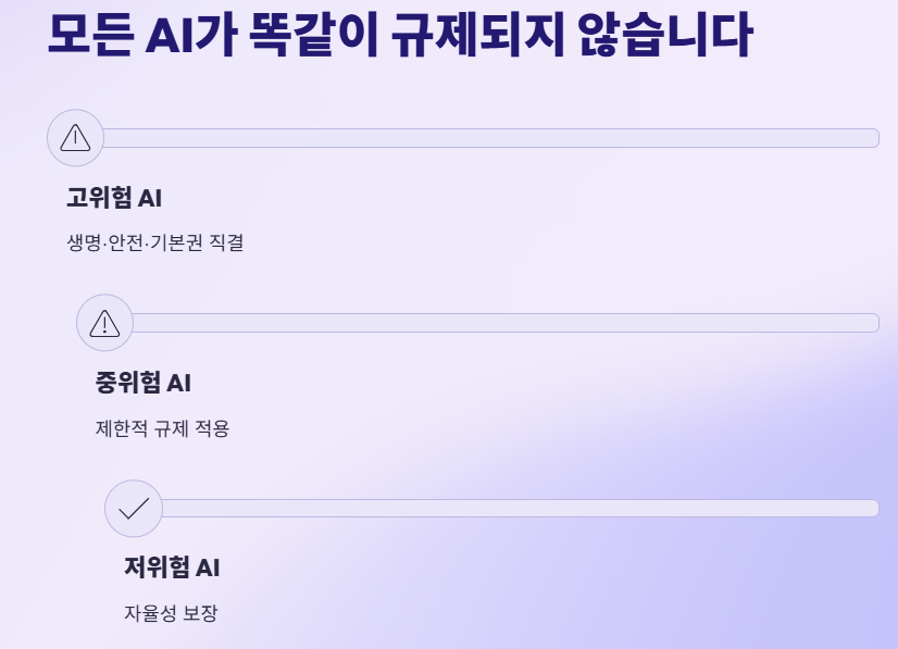 이는 AI가 마치 스마트 기기처럼 우리 삶에 필수적인 도구가 되었을 때, 그 안전성을 담보하려는 조치입니다. 반면, 저위험 AI는 자율성을 보장받아 혁신적인 서비스 개발이 가능합니다.