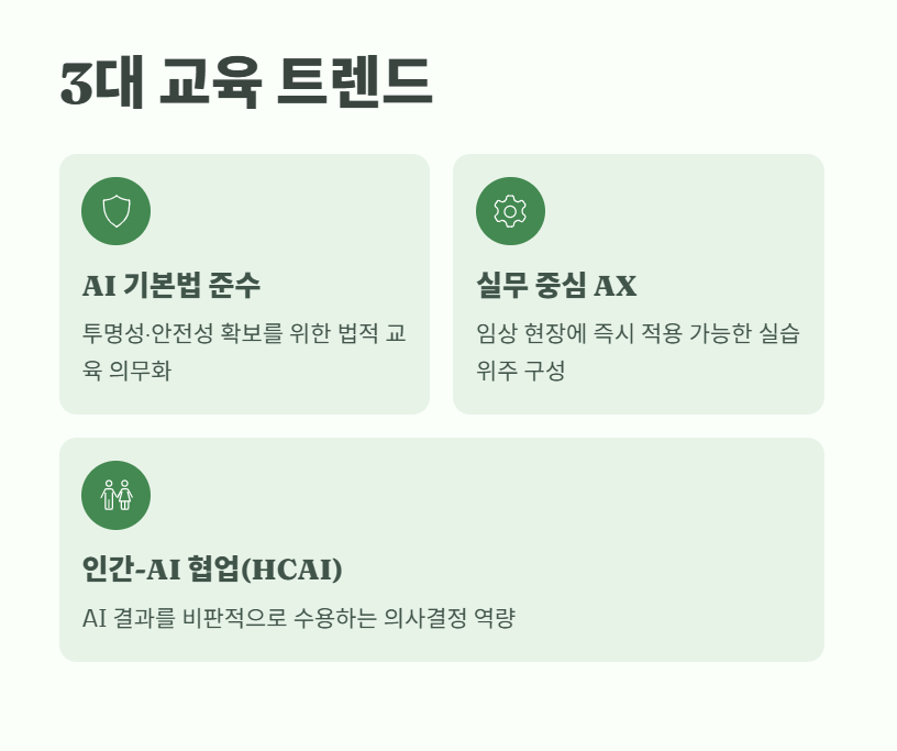 | 기초 과정 | 생성형 AI 활용법, 의료 데이터 리터러시, AI 윤리 기초 | 신입 사원, 학생, 비전공자 |