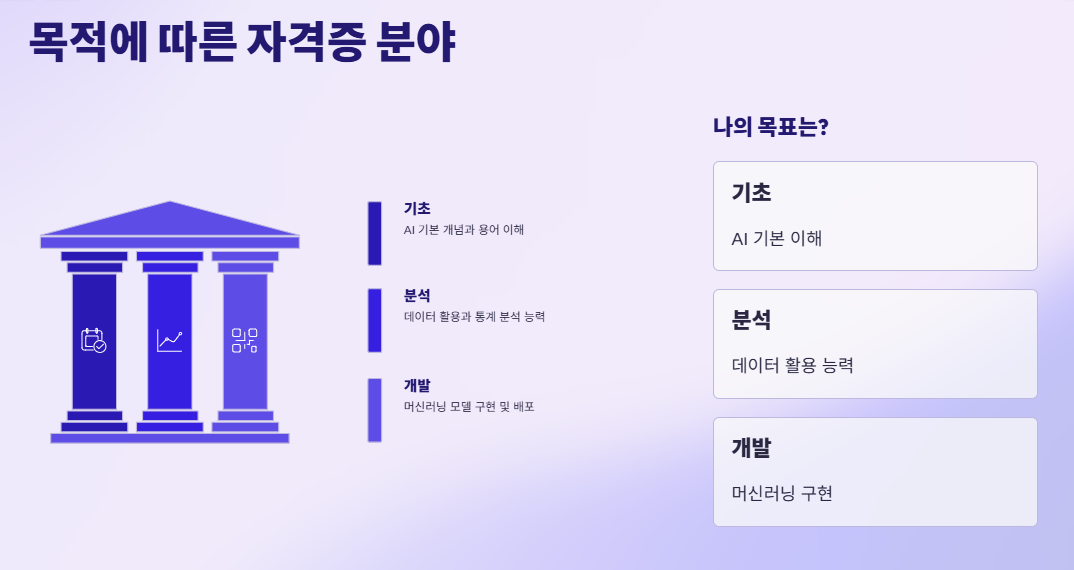 자격증을 고를 때 가장 중요한 건 '목적'입니다. 개발자로 취업하고 싶은지, 아니면 데이터 분석 능력을 기르고 싶은지에 따라 선택지가 달라져요. AI 관련 자격증은 크게 기초, 분석, 개발 분야로 나뉩니다. 자신의 현재 위치를 객관적으로 파악해야 하죠.