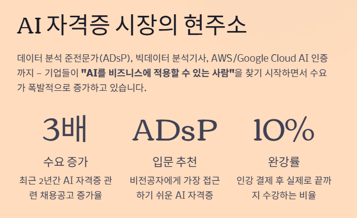 최근 데이터 분석 준전문가(ADsP), 빅데이터 분석기사, 그리고 글로벌 자격증인 AWS/Google Cloud AI 인증 등에 대한 수요가 폭발적으로 증가하고 있습니다. 기업들이 "AI를 할 줄 아는 사람"을 넘어 "AI를 비즈니스에 적용할 수 있는 사람"을 찾기 시작했기 때문입니다.
