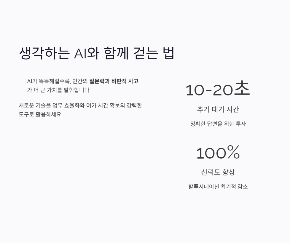A. 아예 사라지지는 않지만, 획기적으로 줄어듭니다. AI가 스스로 답변을 검토하는 과정에서 모순을 발견하고 수정하기 때문에 기존 모델보다 훨씬 신뢰도가 높습니다.